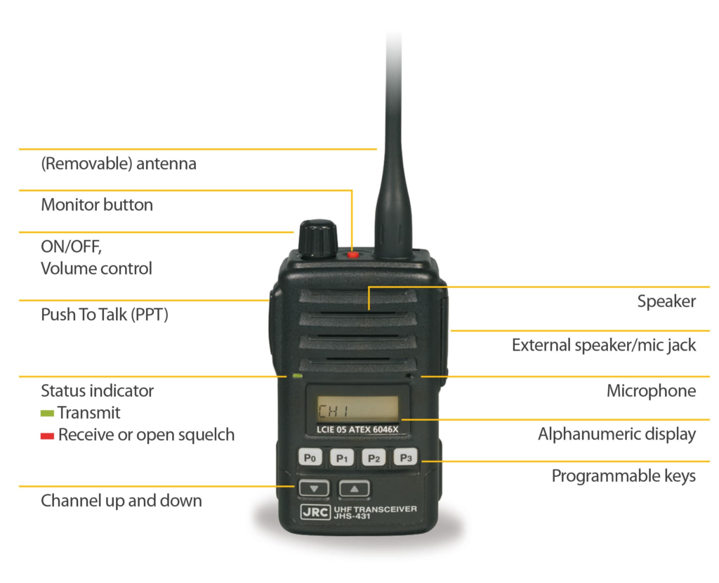 The JHS-431 is a 2-watt UHF intrinsically safe transceiver designed for on-board communication during ship operations, loading/unloading, and mooring. Its intrinsically safe design meets ATEX Directive 94/9/EC, making it suitable for use on Tankers, LPG carriers, LNG carriers, and LO carriers when transporting flammable or hazardous materials
