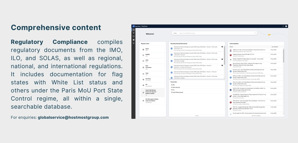 Our partnership with OneOcean enables us to offer the Regulatory Compliance module, also known as Regs4Ships. This digital toolset provides a comprehensive, searchable database of official regulatory documents from trusted sources like the IMO, ILO, and various flag states, all in one platform.